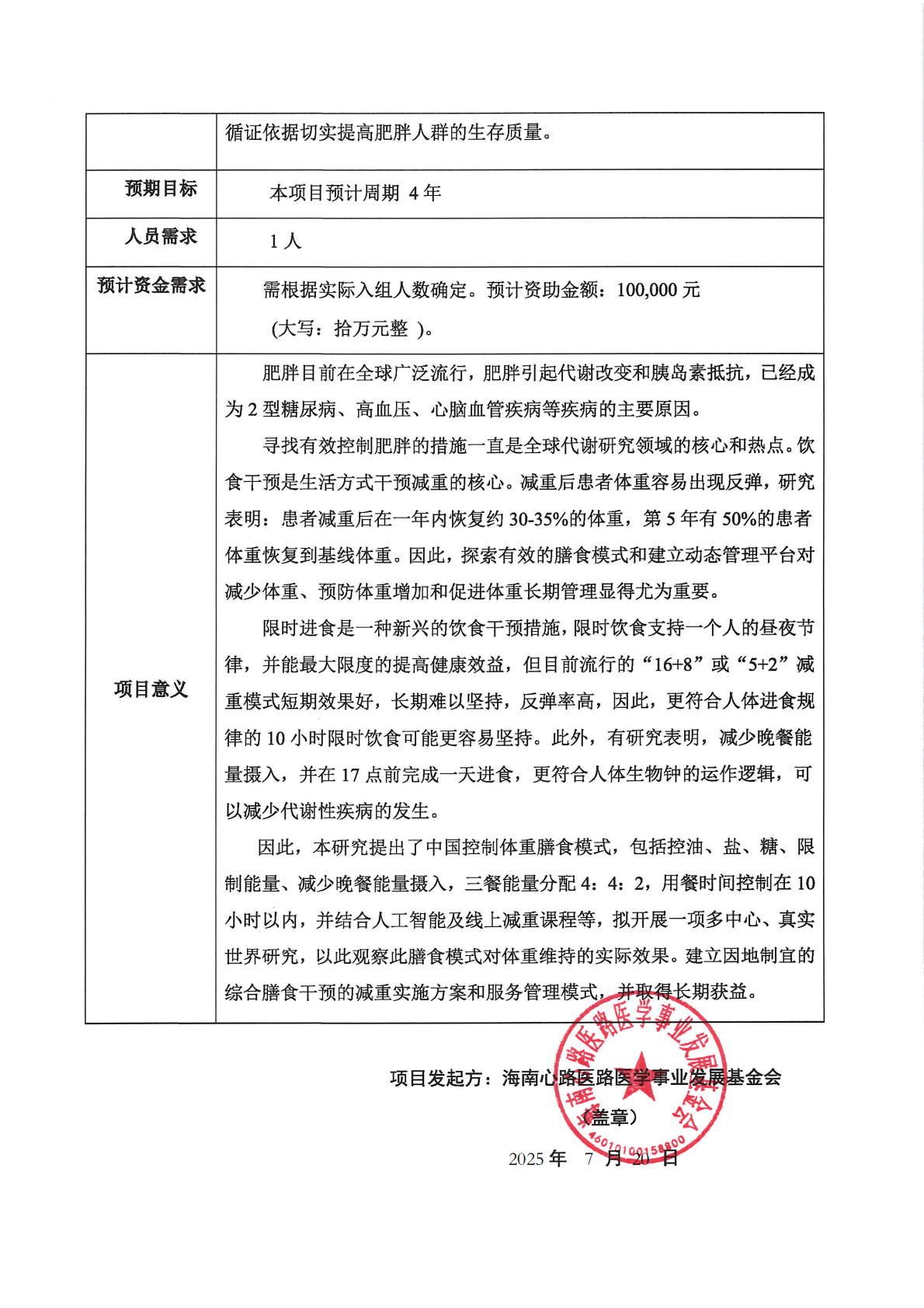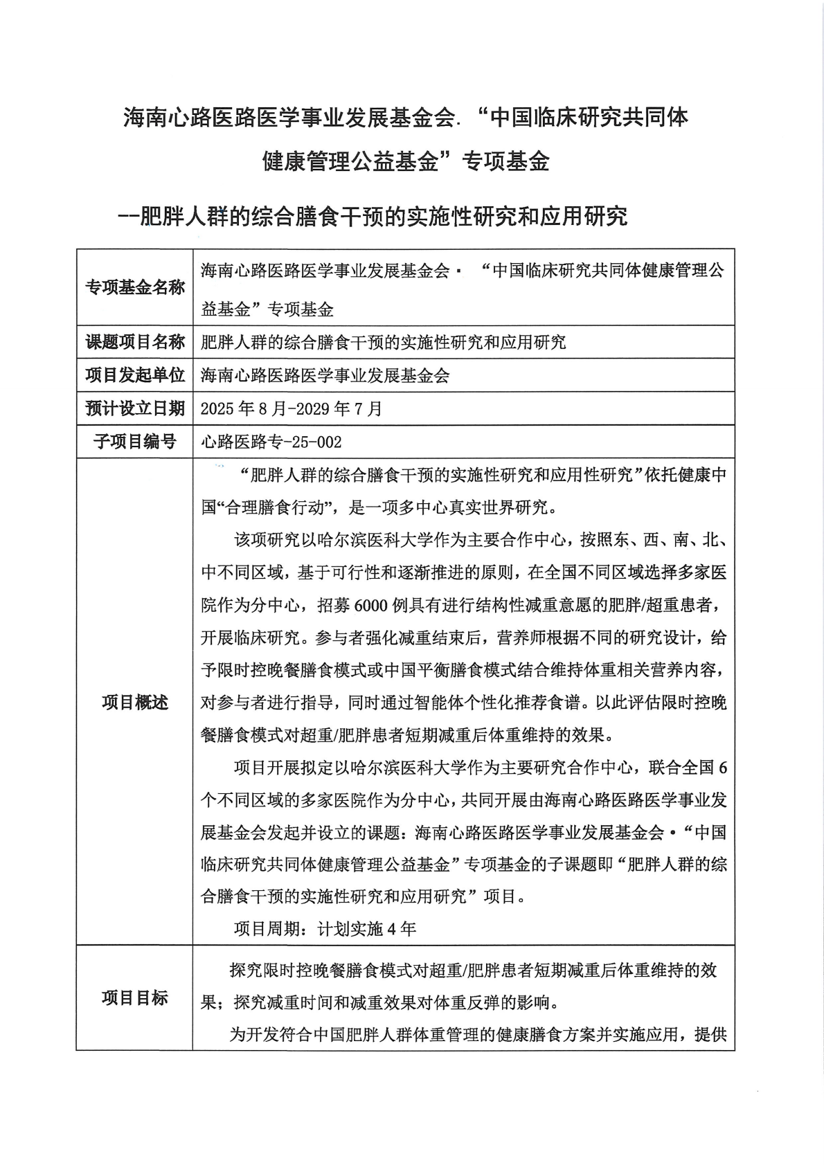 “中国临床研究共同体健康管理公益基金”专项基金—肥胖人群的综合膳食干预的实施性研究和应用研究